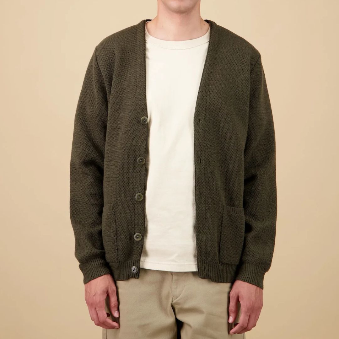 The Youri cardigan uses the same knit and yarn as the Youri sweater, but in a cardigan design. It features the same piqué knit, the same soft feel, and the same range of colors. The two pockets are knitted in the same stitch and directly sewn onto the piece. The collar and button placket are reinforced on the inside with a jersey-knit band for a perfect hold. Its five corozo buttons — a natural material made from the nut of a palm tree — are crafted and dyed in France, in the Baie de Somme.