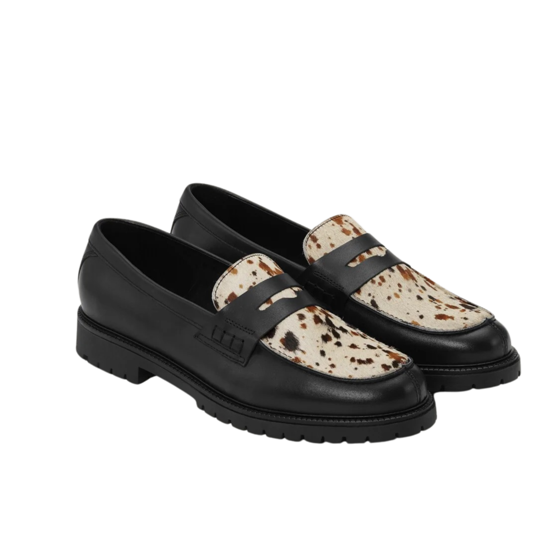 A classic leather loafer elevated with a contrast pony hair look tongue. The printed texture adds character while the silhouette stays clean and refined.