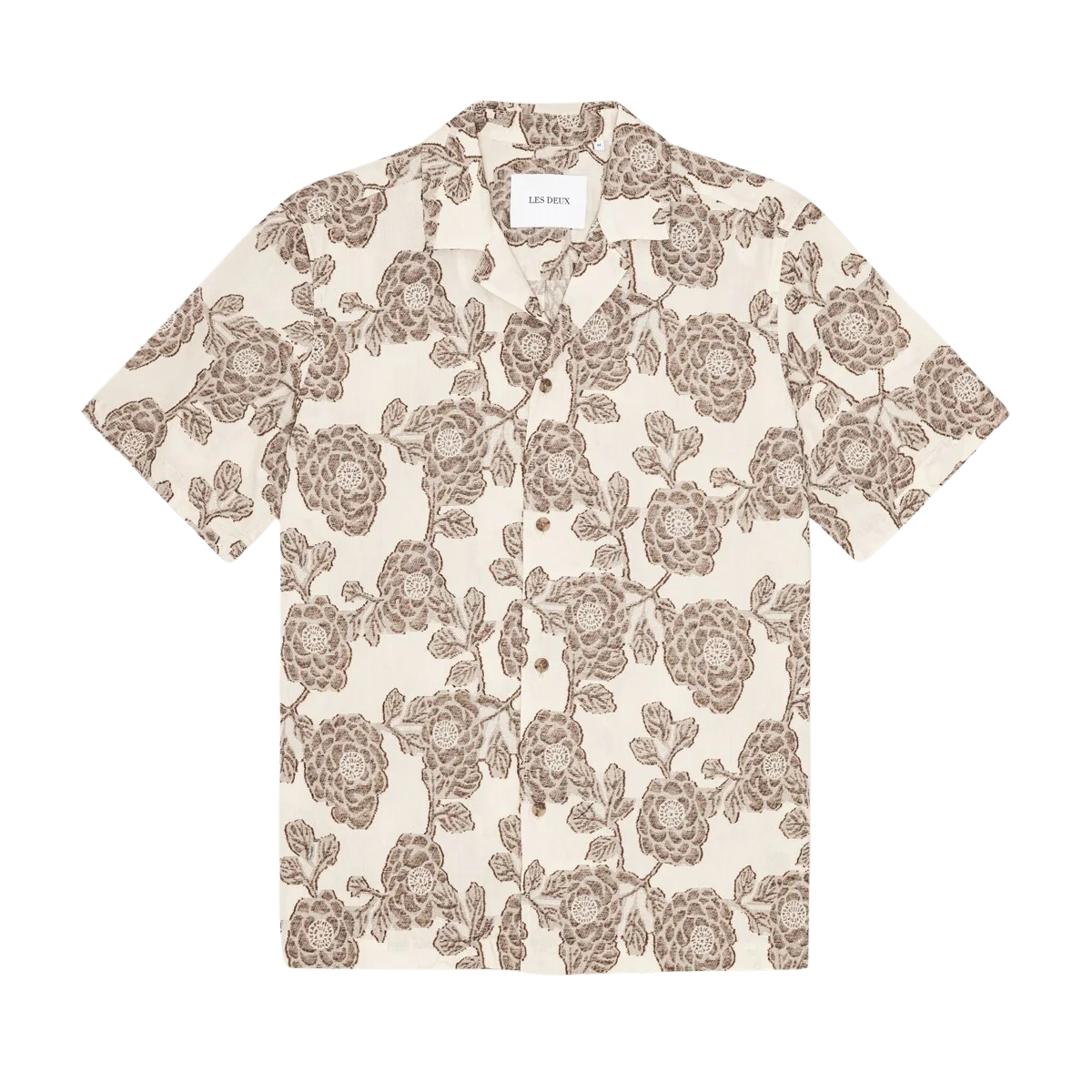 A loose short sleeve shirt cut from lightweight cotton jacquard with an intricate floral pattern. Designed with a relaxed drape, camp collar and bone-look buttons for a refined finish.