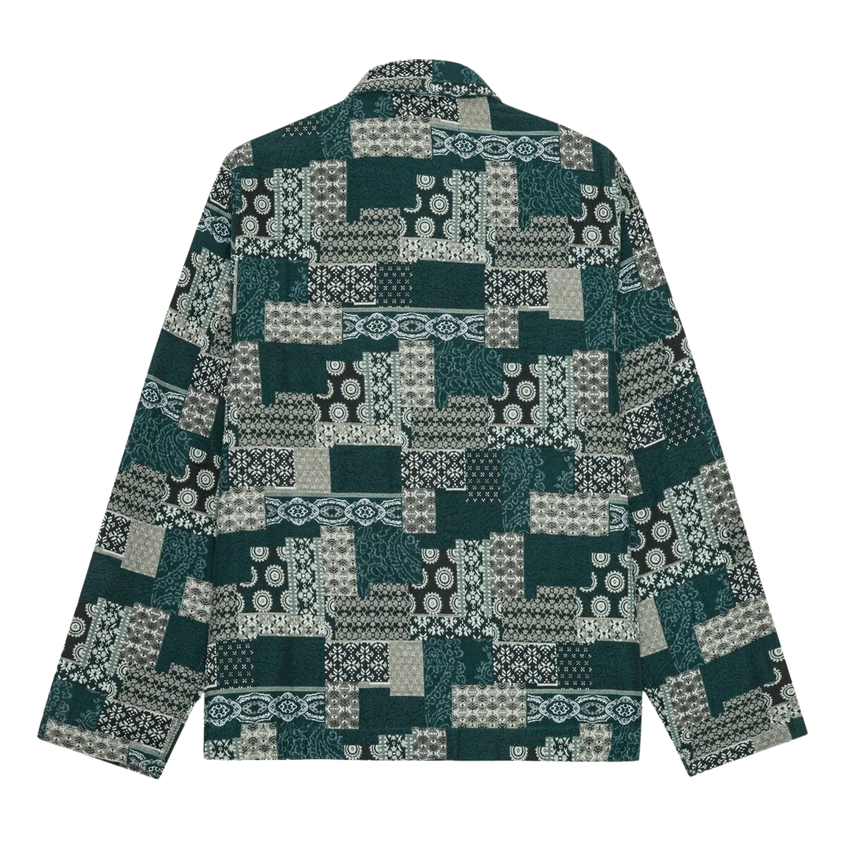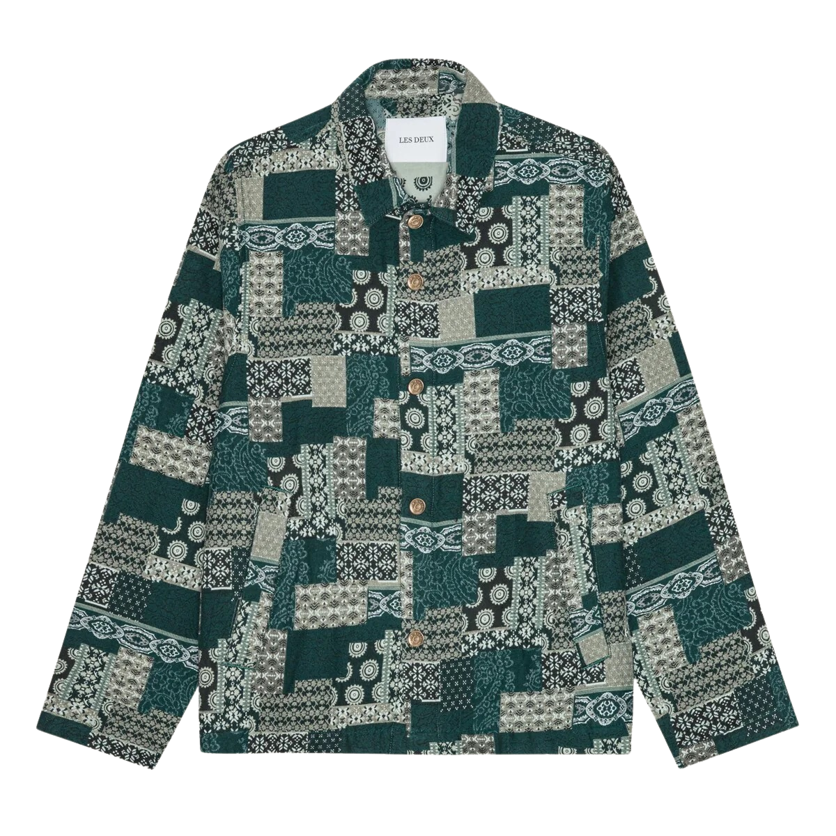 A patterned coach jacket crafted in jacquard patchwork cotton for a textured statement look. Finished with a clean button closure and welted pockets.
