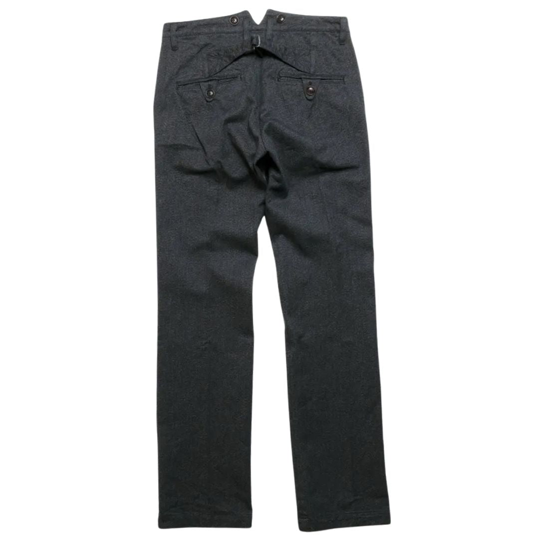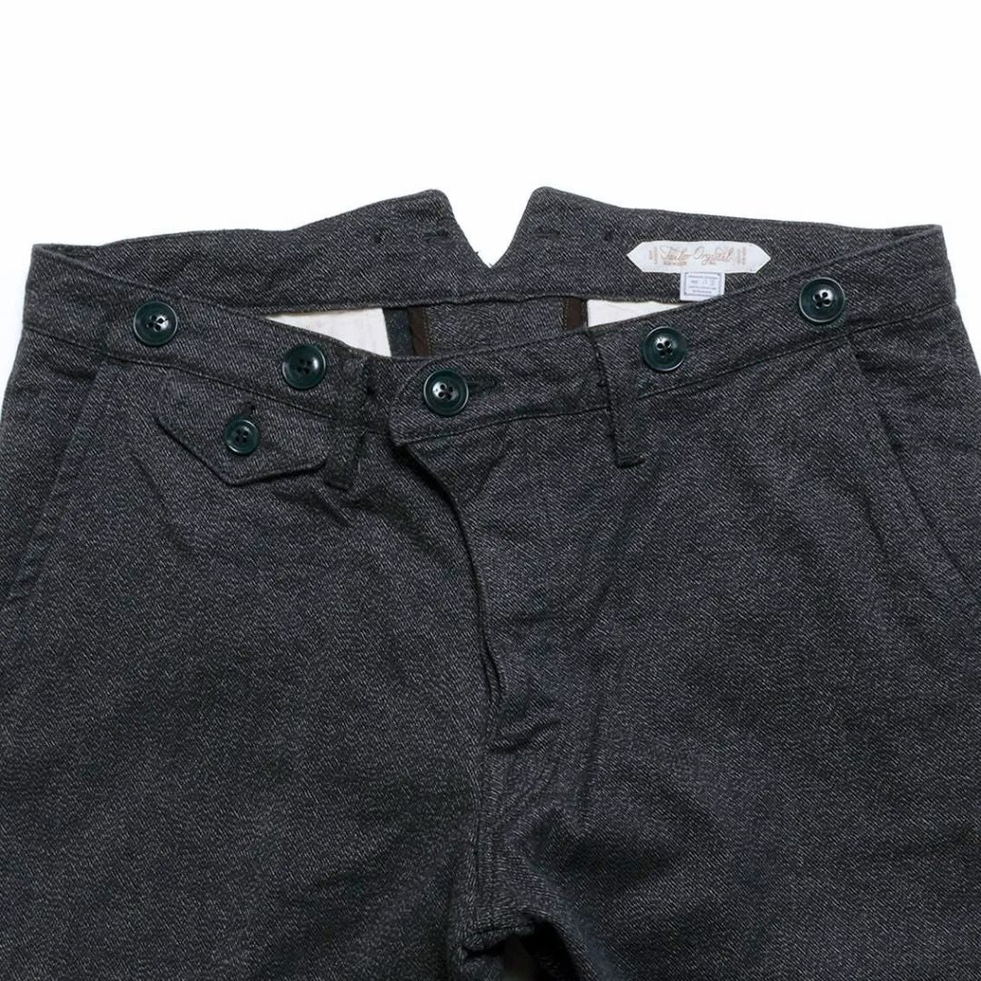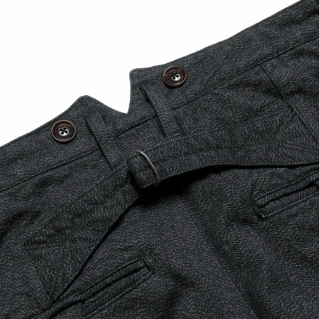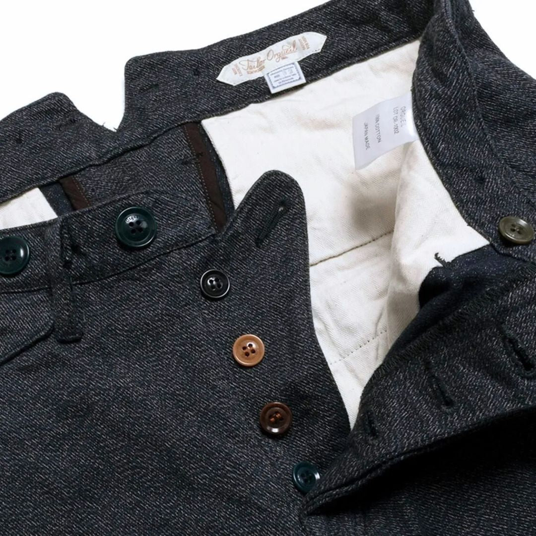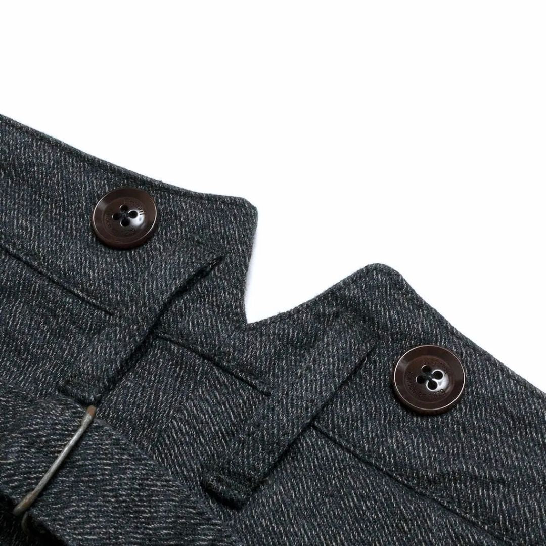 Orgueil’s OR-1002 Low Waist Trousers offer a refined take on classic tailoring with vintage influence. Crafted in Japan from a black heather fabric woven with twisted yarns, the cloth has moderate weight, subtle elasticity, and a supple yet structured feel.