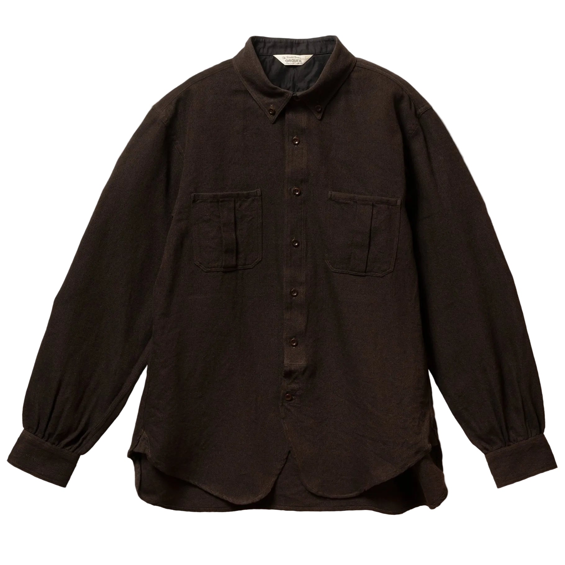 The Orgueil OR-5121 Work Shirt in Brown draws inspiration from vintage pullover shirts, blending classic design with modern functionality. Its front-opening style makes it easy to wear while maintaining a timeless silhouette. Fine gathers at the sleeve cuffs and back yoke add subtle detailing and a refined look.