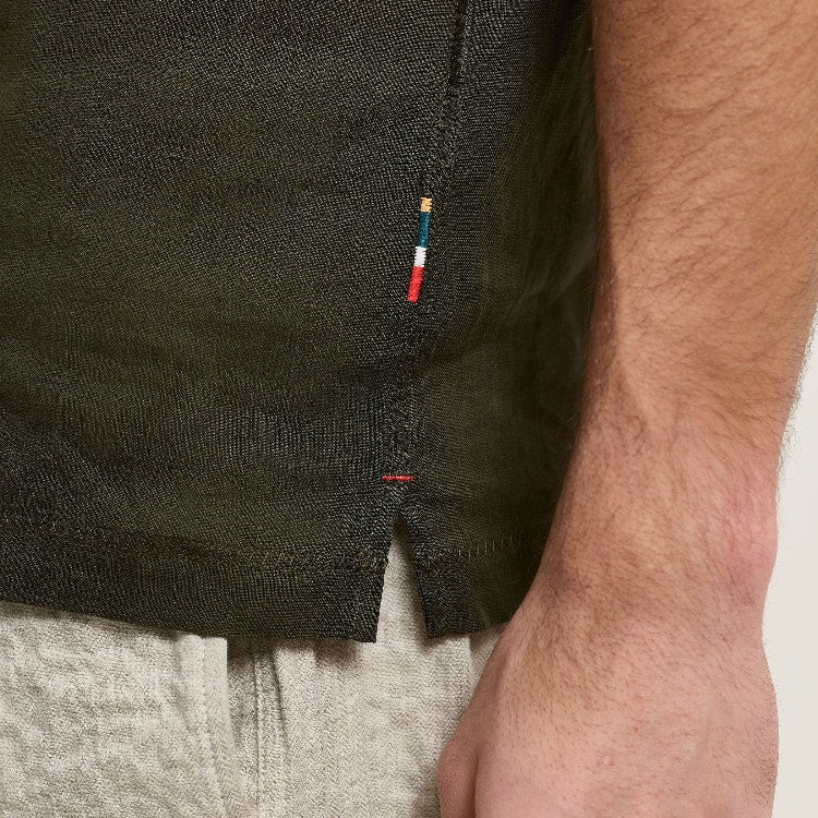 Finished with side seam splits and O.B brand stripe embroidery. It's a linen shirt that wears lightly and ages beautifully. Designed for repeat days and remembered places.