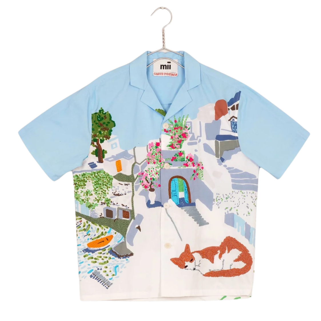 The Anthony shirt is made of cotton poplin and features a screen-printed Greek landscape which transports us to the heart of the Cyclades.