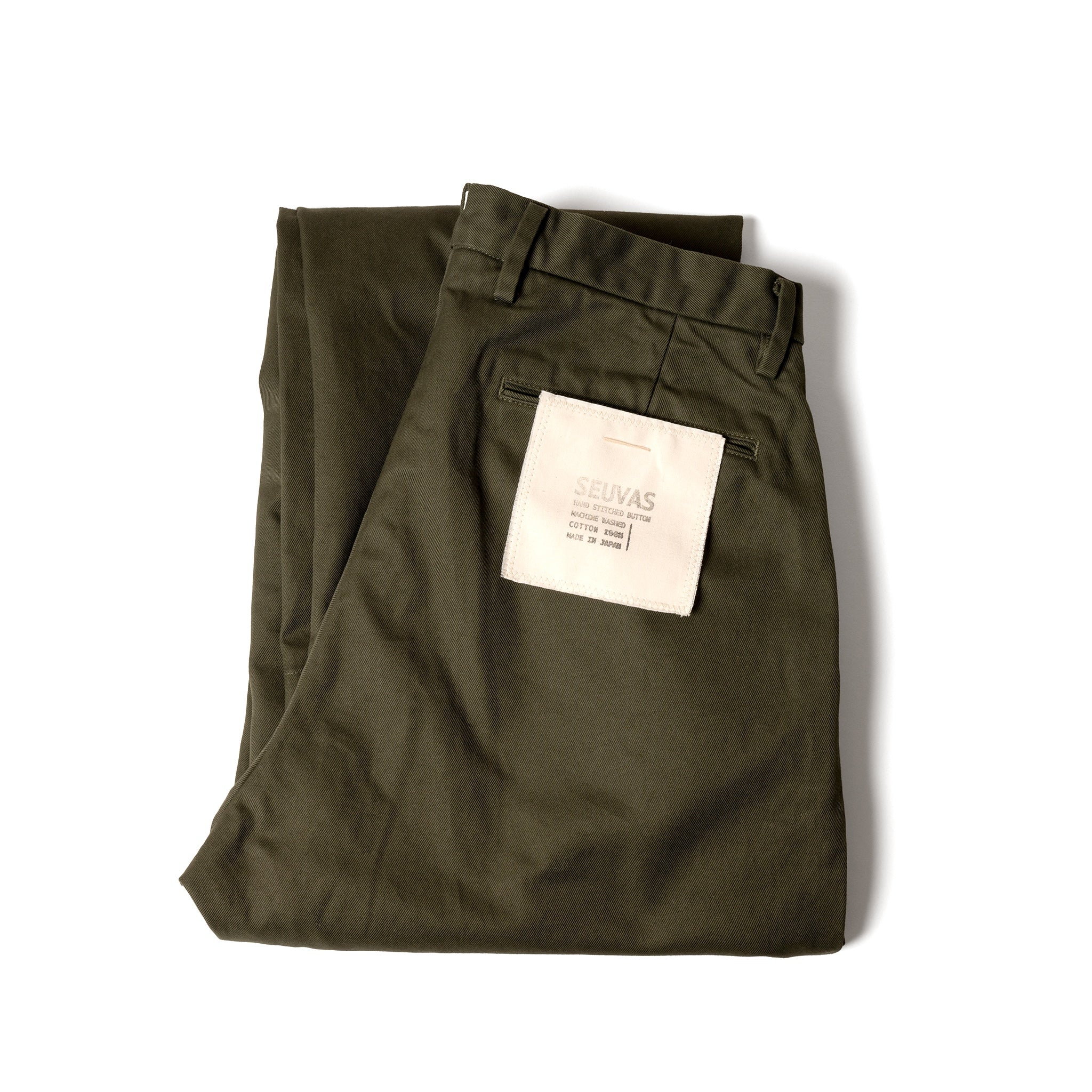 Seuvas' Pleated Chinos in olive elevate everyday casual style with refined tailoring. Constructed from durable cotton, these trousers feature front pleats for a relaxed yet polished fit.
