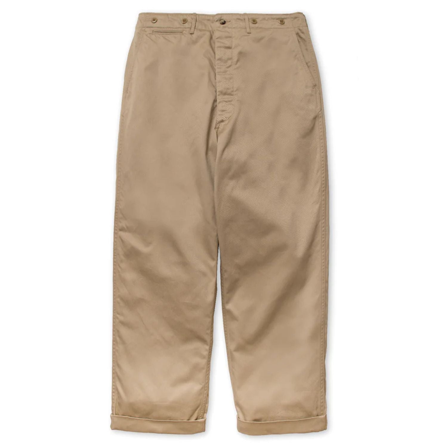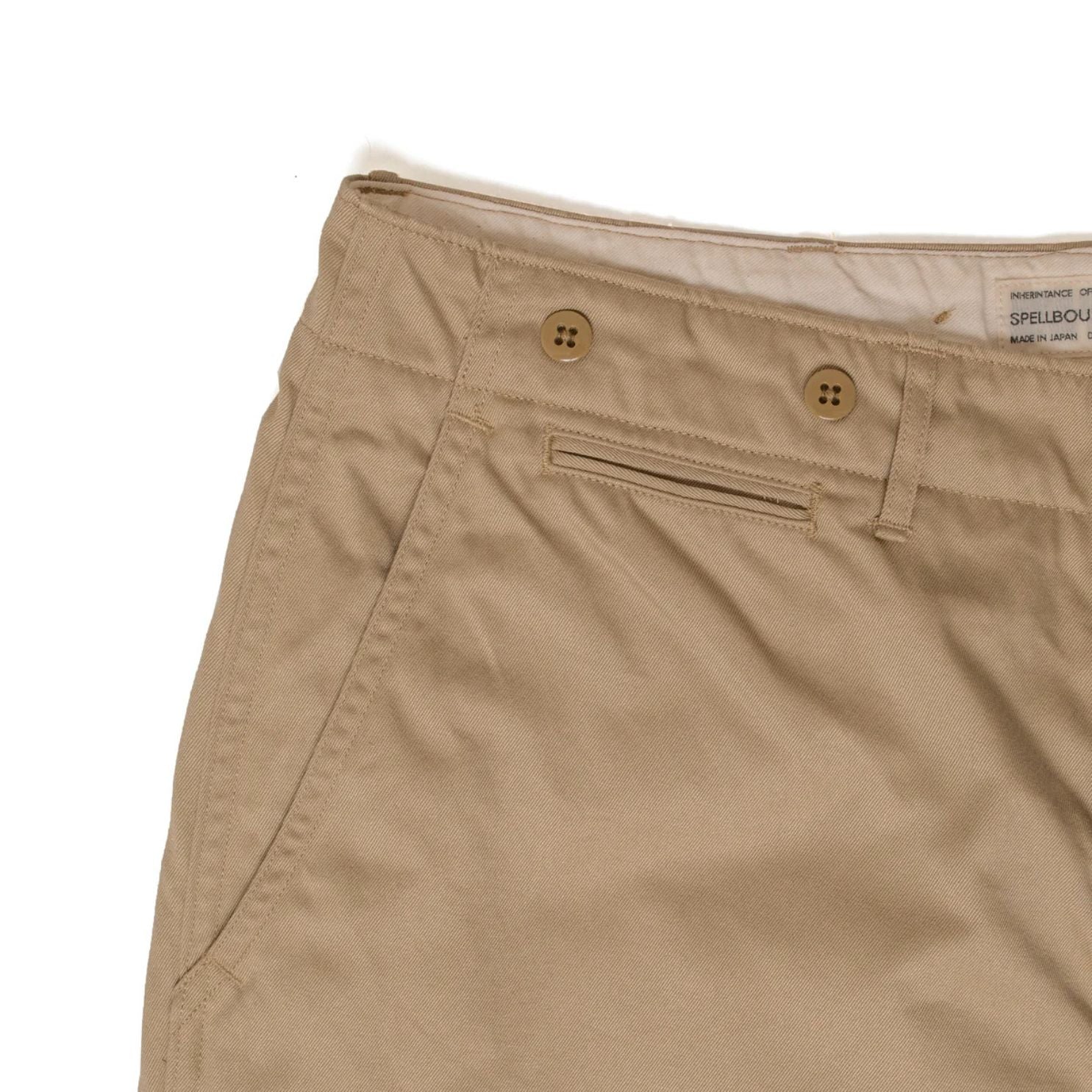 Crafted in Japan, Spellbound’s 44-701T Trousers are made from West Point cotton twill, woven with double yarn for strength, luster, and a refined feel. Inspired by US military ‘43 khakis, they feature a double-folded hem, suspender buttons, and a straight, slightly tapered silhouette. Finished with sun-drying for a crisp hand and lasting structure.
