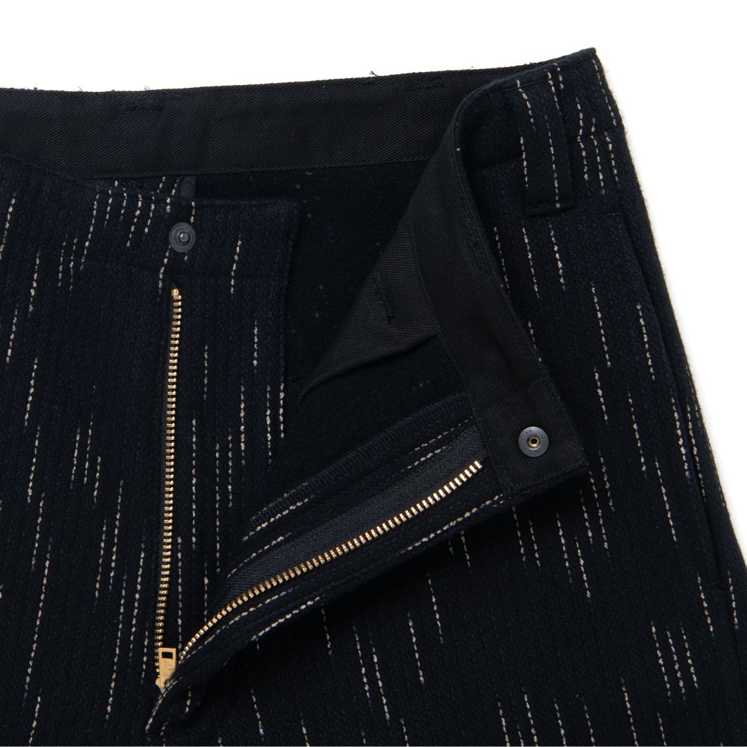 Studio D’Artisan's 1906 Kasuri Dye Beach Cloth Cotton Trousers are crafted from lightweight, textured Japanese cotton for a comfortable yet structured fit. The unique kasuri dyeing technique creates subtle, artisanal patterns that develop character over time.